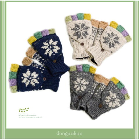 スマホが使えるぬくぬく手編み指なしニットグローブ/雪柄&指先キャンディカラータイプ ウール100% 指先フード付き手袋 f14-11