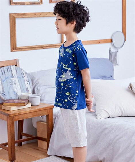 パジャマ キッズ 綿100% 光る プリント 半袖 男の子 女の子 子供服 ジュニア服 オフホワイト+杢グレー/ネイビー+杢グレー 身長170cm ニッセン nissen