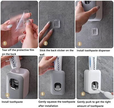 歯磨き粉絞り器を取り付ける前に壁をきれいにし、粘着ストリップを十分に押し、使用前に粘着ストリップを壁に完全に接着します。